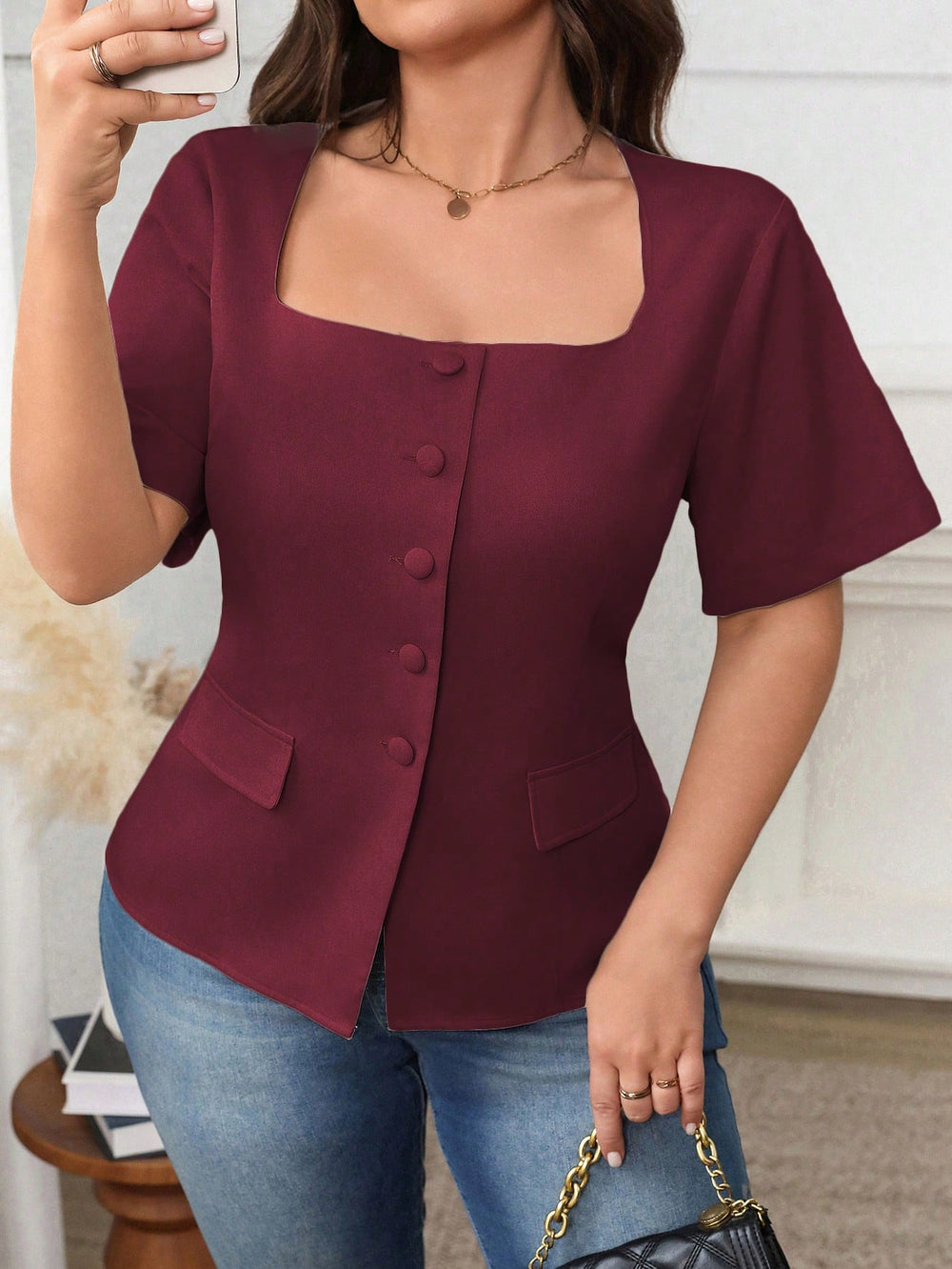Cămașă cu mâneca scurtă SHEIN, vișiniu